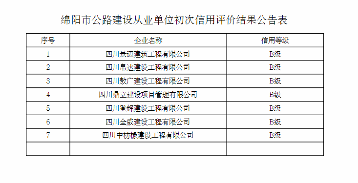 綿陽市公路建設(shè)從業(yè)單位初次信用評價結(jié)果公告表.pdf